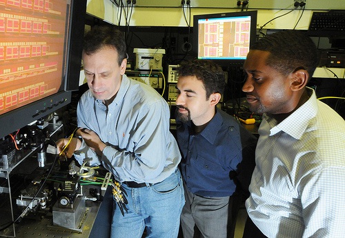 IBM Scientists (L to R) Yurii Vlasov, William Green and Solomon Assefa unveiled a new CMOS Integrated Silicon Nanophotonics chip technology that integrates electrical and optical devices on the same piece of silicon, enabling computer chips to communicate using pulses of light (instead of electrical signals).