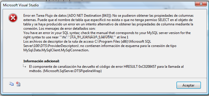 Il conducente ha un problema e non lasciare che lavoriamo bene con parametri (che è come hanno costruito gli inserimenti di record del destination), so che abbiamo a che fare un'altra soluzione per risolvere questo problem working con ADO.NET destinazione su arrival but con un sorgente ODBC nella connessione. Questa accoppiata con il tema della modifica della destinazione sql_mode MySQL ci permettono di caricare correttamente.