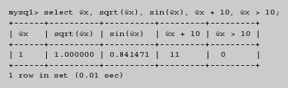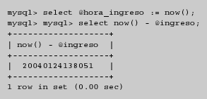 MySQL dispone de variables de sesión, visibles únicamente durante la conexión actual. Éstas pueden almacenar valores de tipos enteros, flotantes o cadenas, pero no tablas. Se definen como en el siguiente ejemplo:
