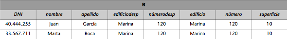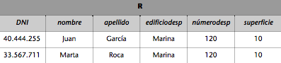La relación R combina los datos de cada empleado con los datos de su despacho.
