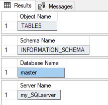 SELECT PARSENAME('my_SQLserver.master.INFORMATION_SCHEMA.TABLES', 1) AS 'Object Name';