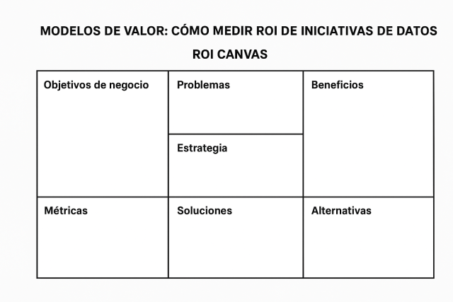 Para estructurar la discusión sobre valor, proponemos un ROI Canvas, inspirado en el modelo de Lean Canvas pero adaptado a iniciativas de datos. Consta de ocho bloques: