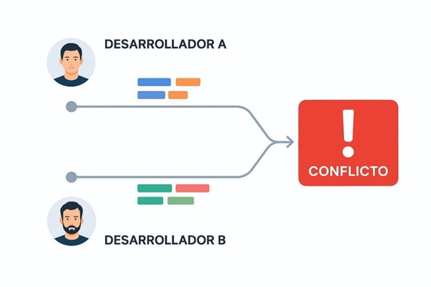 También influyen la latencia y los ciclos de sincronización en la nube. Si alguien trabaja en local durante mucho tiempo sin "subir" sus cambios (push) ni "bajar" los cambios de sus compañeros (pull), su copia del proyecto se aleja mucho de la rama principal. Cuanto mayor es esa distancia, más difícil se vuelve la fusión, porque el sistema debe comparar miles de líneas modificadas durante días o semanas, aumentando mucho la probabilidad de conflictos lógicos y de contenido.