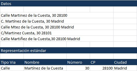 Para ello y apoyándonos en el perfilado de datos realizado inicialmente hay que realizar un parsing de datos, el analizador sintáctico debe extraer componentes con significado, en nuestro ejemplo direcciones postales, que después puedan ser normalizados.