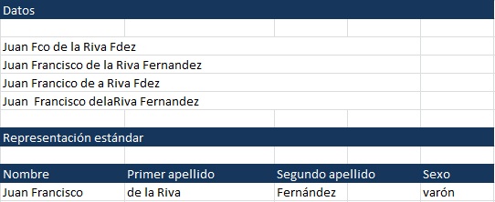 - Dividir cadenas en nombre, primer y segundo apellido. Obtener representación estándar considerando nombres y apellidos compuestos, preposiciones que preceden apellidos, etc..