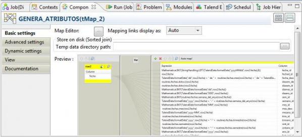 4) las fechas generadas las pasamos a otra transformación (MAP), donde para cada fecha, generamos todos los atributos de la dimensión tiempo según la tabla de transformación que hemos indicado anteriormente (mes, año, dia, dia de la semana, trimestre, semestre, etc). Utilizamos el componente tMap del grupo Processing.