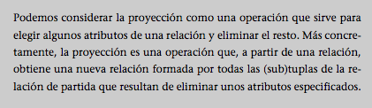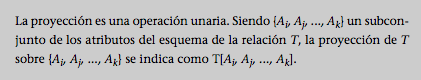 Para obtener una relación que tenga sólo los atributos nombre y apellido de los empleados de administración, podemos hacer una proyección en la relaciónEMPLEADOS_ADM sobre estos dos atributos. Se indicaría de la forma siguiente: EMPLEADOS_ADM [nombre, apellido].