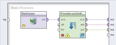 2. Agregar el operador Modeling → Attribute Weighting → Optimization → Optimize Weights (Evolutionary). Cambiar el nombre del mismo a “PonderaciónEvolutiva” y los parámetros population size y maximum number of generations a 1 y 10, respectivamente. Conectar la salida del operador Retrieve a la entrada exa de este operador, y las salidas exa (example set out), wei (weights) y per (performance) a conectores res del panel.