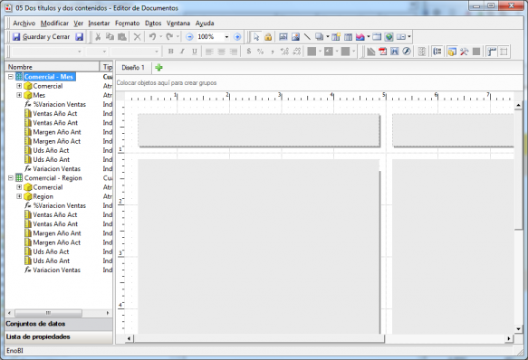 El editor de Documentos es el elemento central desde el cual vamos a realizar el diseño nuestro documentos y tableros. Como ya hemos indicado, podríamos realizar el diseño de los documentos desde el entorno Web, pero en nuestro caso nos vamos a centrar en el Desktop. Via Web la funcionalidad es muy similar y hay pequeñas diferencias.