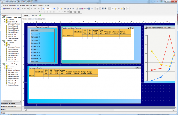 Por otro lado, tenemos los documentos del tipo Tablero, orientados a la creación de tableros, tarjetas de puntuación y cuadros de mando. Documentos que tratan de concentrar en un unico pantallazo (aunque pueda tener varias secciones o pestañas), toda la información. Con una presentación de calidad, gráfica e intuitiva para permitir el analisis de la información de una forma fácil. En la imagen posterior, podeis ver el diseño de un cuadro de mando para analizar la información por comercial. Es un informe dinámico, donde al seleccionar el agente comercial que queremos analizar, se actualizaran los otros 3 controles del tablero, uno donde se analizan las ventas por linea de producto, otro por region y en el gráfico la evolución mensual de ventas.