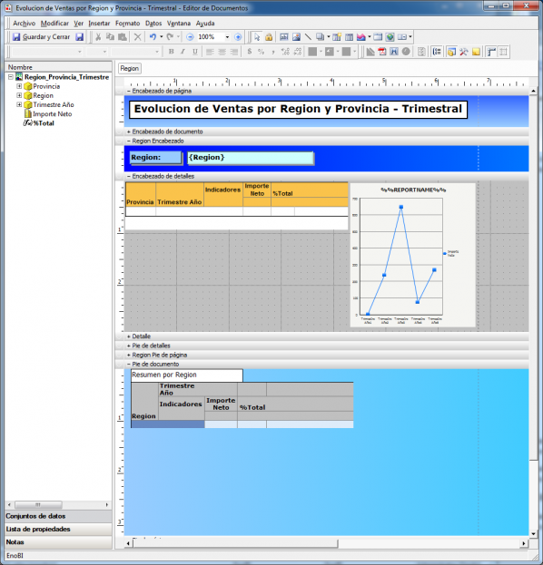 Para ver un ejemplo de un documento del tipo general, vamos a construir un informe de Evolución de Ventas por Region y Provincia trimestral. Será un informe estático que sera enviado por correo a las delegaciones en formato PDF. Se trata de darle una presentación atractiva pues será un documento corporativo.