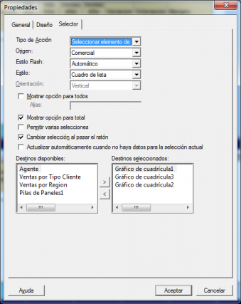 Además, en el objeto Selector del tipo lista de valores (en que determinara el comportamiento de los otros objetos), indicaremos los destinos seleccionados. Son los objetos cuyo contenido se modifica al seleccionar un determinado valor de atributo en el selector (y por tanto, varia la información que se muestra en ellos).