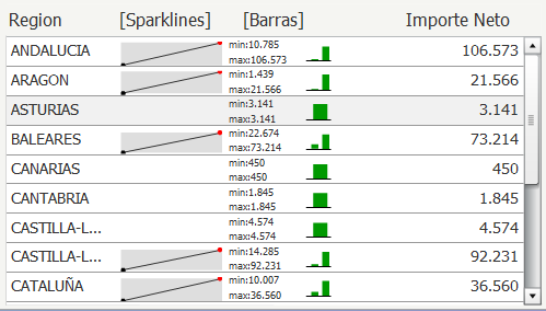 A continuación, construimos, en la sección Encabezado detalles una cuadricula y un gráfico. Para ello, insertamos primero el control y a continuación le añadimos los atributos e indicadores deseados arrastrandolos y dejandolos caer sobre el control. Cuando se hace doble click en el control del tipo cuadricula, se puede editar ademas la disposición de filas y columnas, así como realizar ajustes en el formato, añadir umbrales, totalización o crear indicadores calculados. En la cuadricula veremos una evolución de las ventas por provincias y trimestre del año, añadiendo un porcentaje de ventas sobre el total (solo se veran las ventas de las provincias de cada región). En el gráfico, veremos solo el total de ventas de cada región, desglosado por trimestre para ver de una forma gráfica la evolución.