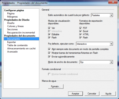 - Propiedades del documento: estilo por defecto para las cuadriculas que se incluyan en el, modos de visualización disponibles (podremos hacer que un documento solo se pueda ver, por ejemplo, en modo Flash), formatos de exportación permitidos, modo de ejecución por defecto del documento, propiedades de exportación (por ejemplo, si al exportar a PDF se incluiran marcadores o se mejorara la resolución de gráficos).