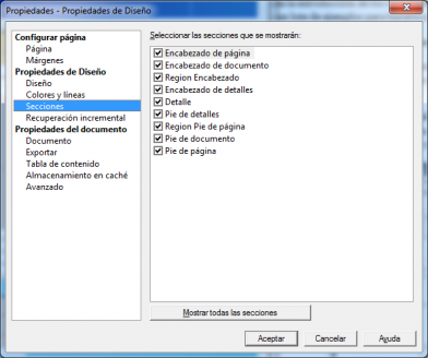 Al crear el documento, seleccionamos que sea del tipo General. En ese momento, nos aparece la cuadrícula de diseño, donde podemos ver las diferentes secciones del documento ( Encabezado de página, encabezado de documento, detalle, pie de detalles, pie de documento y pie de página). Se puede controlar facilmente que secciones se visualizan y cuales no, desde las propiedades del documento, tal y como vemos en la imagen: