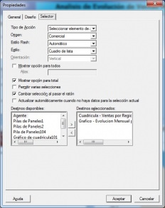 - Selector (del tipo cuadro de lista): este control estará asociado a los valores del atributo Agente Comercial. En el control se mostrara la lista de todos los agentes que tienen ventas en el periodo y un atributo Total (para el total de todos ellos). Este valor aparecerá marcado por defecto. Los controles Evolución Mensual Ventas por Agente y Ventas Anuales por Región estarán vinculados al selector, de forma que al cambiar el valor seleccionado, la información de los otros controles variara dinamicamente.