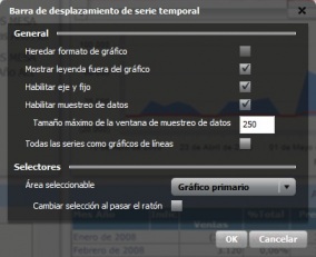 - Modo Flash: es igualmente un modo de ejecución. Las opciones de ajuste de los componentes estan muy limitadas (casi inexistentes). Como mucho se pueden ordenar o mover columnas a izquierda y derecha.En este modo si funcionan todos los widgets y se pueden configurar las propiedades de ellos. En el modo Flash no funciona la navegación dimensional ni se puede realizar actividad alguna sobre los datos (creación indicadores, creación elementos derivados, formato, totalización, etc). Pero si podremos darle interactividad a los informes, pues los Selectores si funcionan. Cuando exportamos un documento en modo flash, con el archivo generado se integran todos los datos presentes en la ejecución del documento (habra que tenerlo en cuenta, pues puede que veamos una pequeña parte de los datos en los controles, pero en los conjuntos de datos haya mucha información, que hara que el fichero flash sea muy grande). En la imagen, configuración de la barra de desplazamiento de serie temporal.
