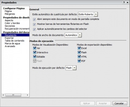 El modo por defecto en el que se ejecuta un documento, así como los modos disponibles son propiedades que se indican a nivel de documento, tal y como vemos en la imagen siguiente. Por tanto, nosotros determinaremos que modo de visualización va a estar disponible. Si, por ejemplo, usamos controles widgets, lo lógico sería verlos en el modo Flash. De la misma forma, si utilizamos gráficos que no se van a visulizar en modo Flash, lo lógico sería utilizarlos en modo Interactivo.