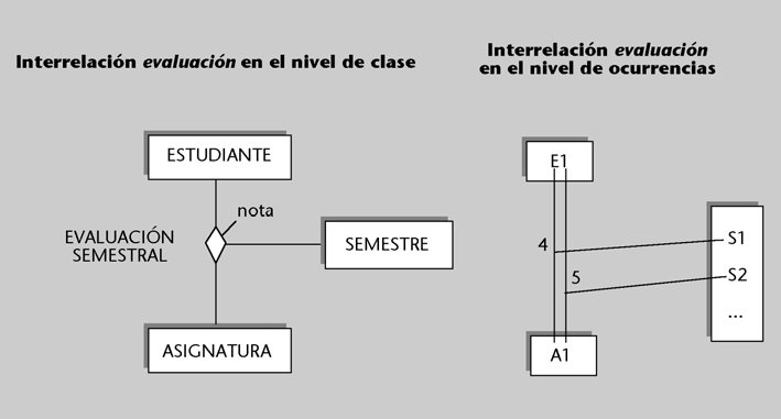 Para analizar la conectividad M:N, consideramos la interrelación evaluación de la figura anterior. Nos indica que un estudiante puede ser evaluado de varias asignaturas y, al mismo tiempo, que una asignatura puede tener varios estudiantes por evaluar.