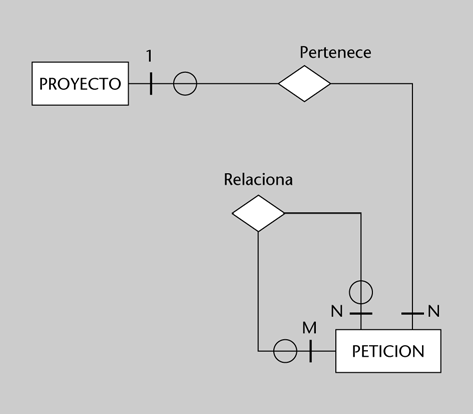 PROYECTO(codigo, nombre, fechainicio, fechafin)La relación 1:N entre PROYECTO y PETICIÓN se transformará en la inserción de una nueva clave foránea en la relación PETICION, que podrá tener valor NULO si la petición no pertenece a ningún proyecto; es decir, si se trata de una petición aislada. La relación PETICION quedaría así: