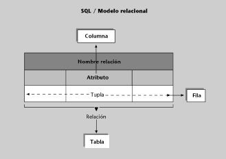 El modelo relacional tiene como estructura de almacenamiento de los datos las relaciones. La intensión o esquema de una relación consiste en el nombre que hemos dado a la relación y un conjunto de atributos. La extensión de una relación es un conjunto de tuplas. Al trabajar con SQL, esta nomenclatura cambia, como podemos apreciar en la siguiente figura: