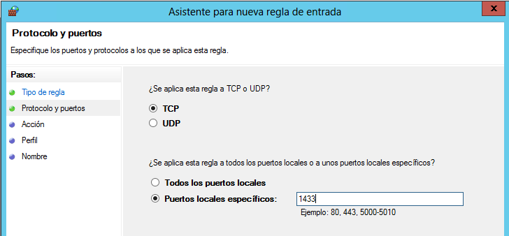 En este ejemplo utilizamos el puerto por defecto de SQL Server 1433, aunque para más seguridad es recomendable utilizar puertos diferentes, pero ese es otro tema..
