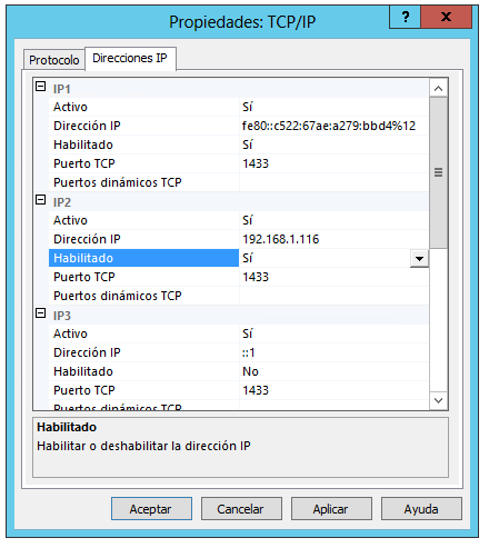 Habilitar el protocolo TCP/IP sobre la dirección IP del server