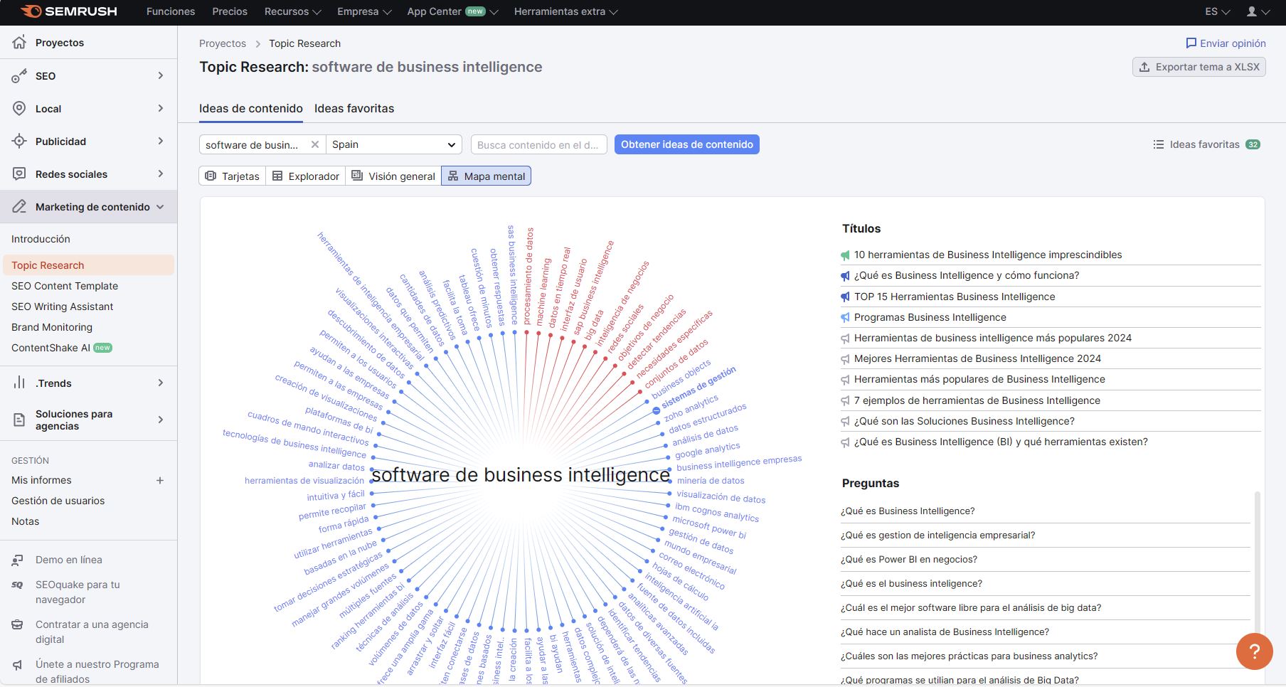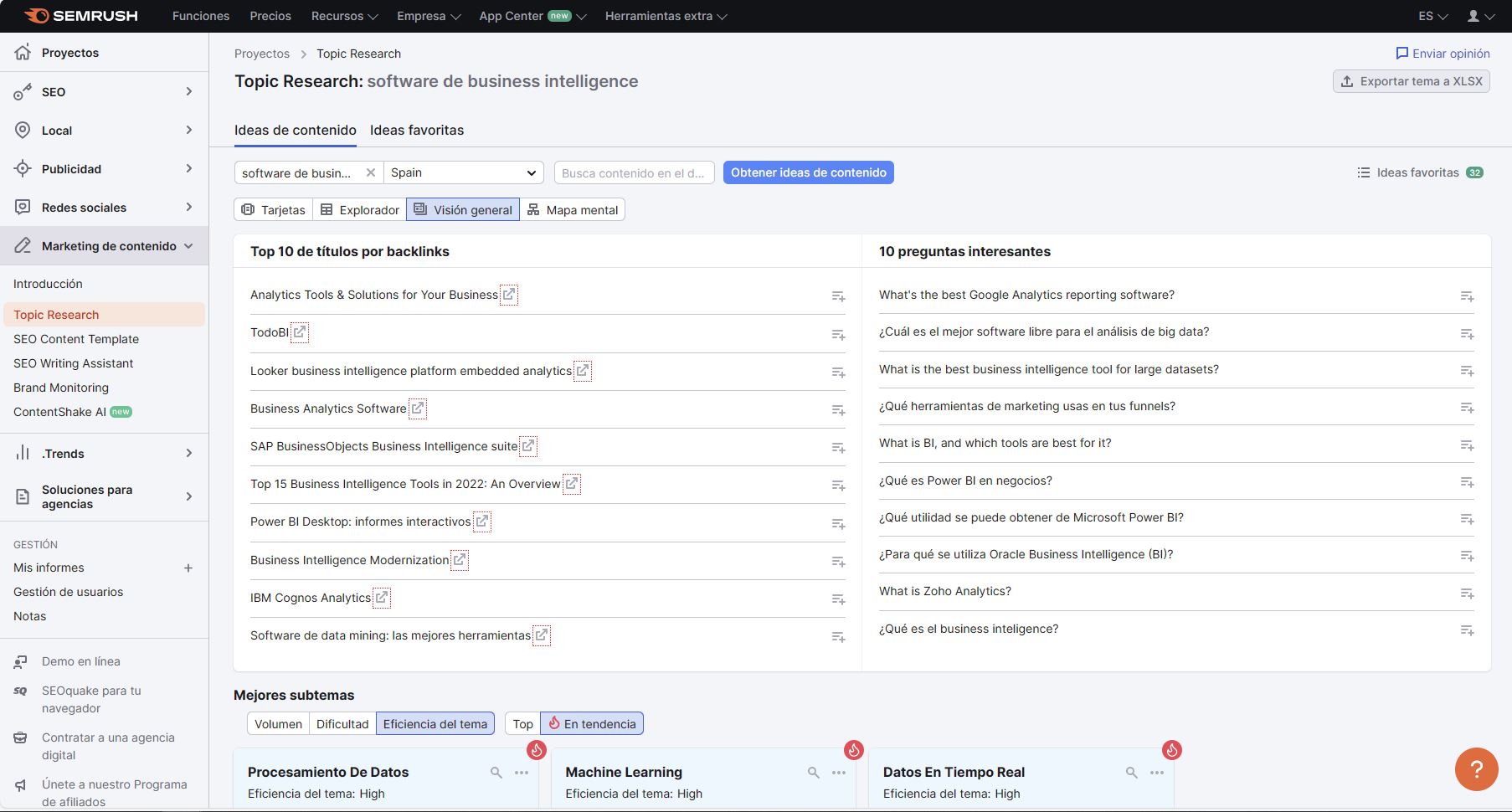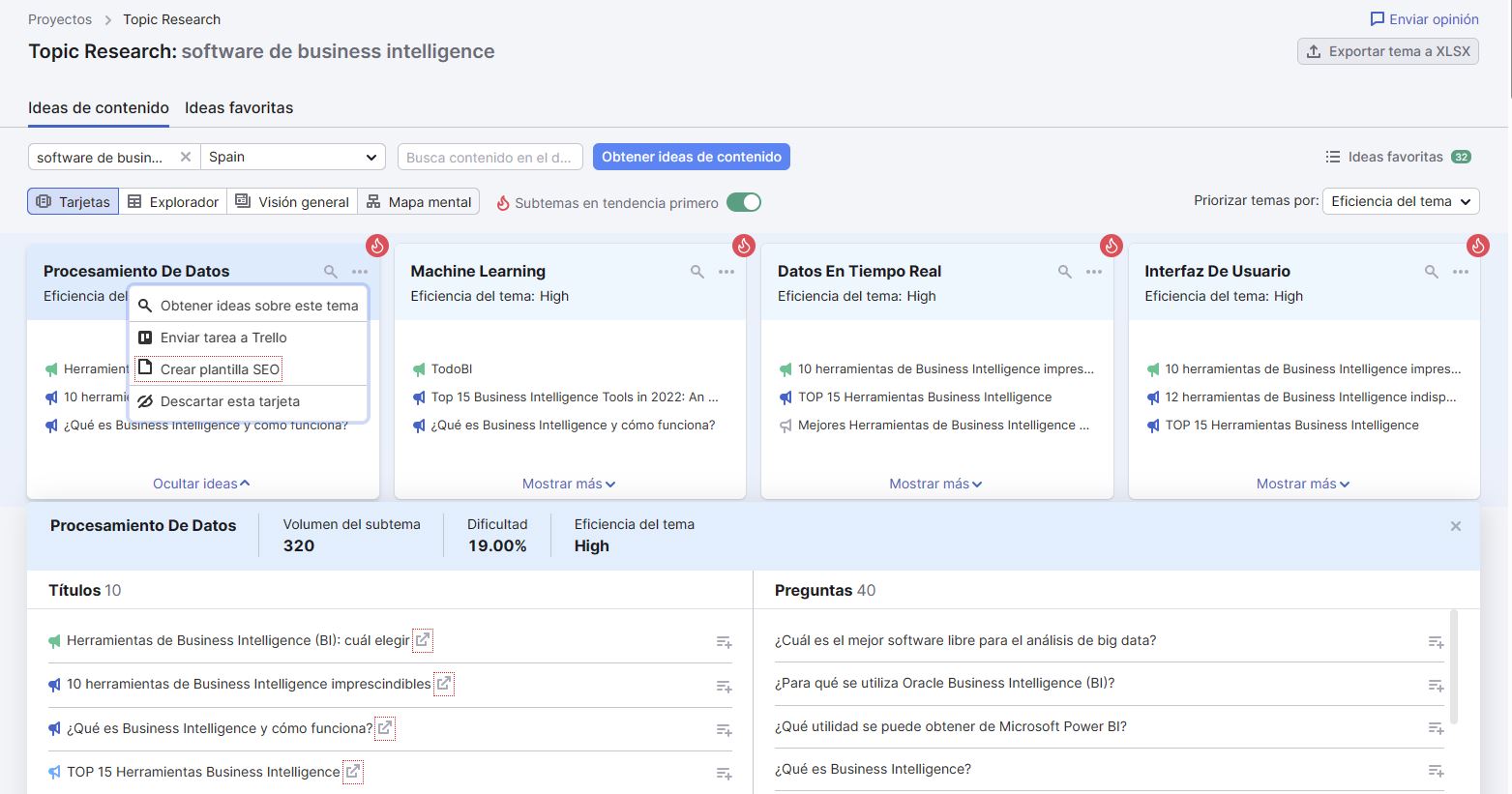 Topic Research es una herramienta innovadora que te proporciona información detallada sobre los temas más relevantes para tu industria. A través de esta funcionalidad, puedes acceder a datos sobre las consultas más populares que realizan los usuarios en los buscadores, lo que te permite identificar tendencias y oportunidades de contenido.