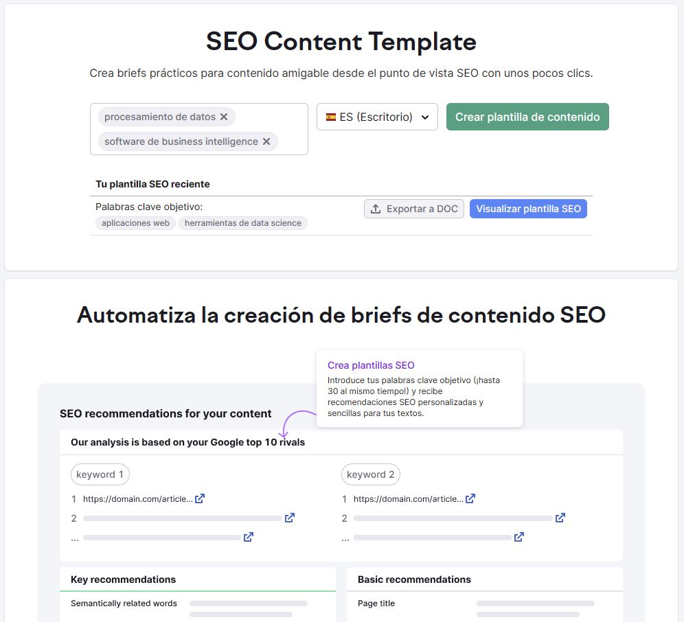 SEO Content Template es una utilidad que te ayuda a crear briefings de contenido optimizados para SEO, basados en los datos de los 10 mejores resultados orgánicos para tus palabras clave.