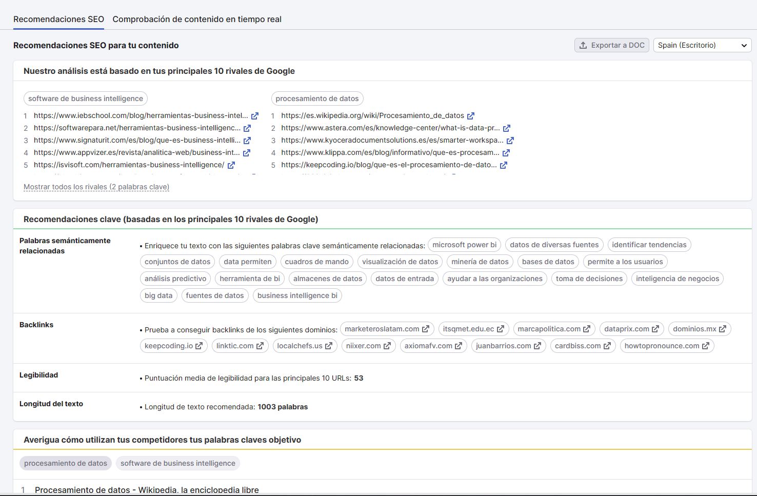 También puedes exportar todas las recomendaciones a un documento word o, lo más interesante, y último paso de nuestro artículo, pulsando el enlace de ‘Comprobación de contenido en tiempo real’ se abrirá el SEO Writing Assistant con toda esta información incluída para que puedas preparar finalmente la publicación siguiendo estas pautas SEO.
