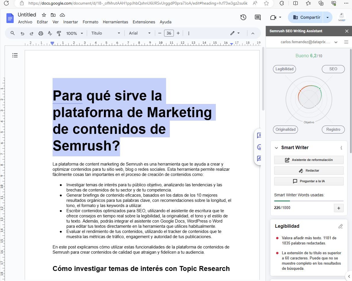 - Escribir contenidos optimizados para SEO, utilizando el asistente de escritura que te ofrece consejos en tiempo real sobre la legibilidad, la originalidad, el tono y el estilo de tu texto. Además, podrás integrar el asistente con Google Docs, WordPress o Word para editar tus textos directamente en la herramienta que utilices habitualmente.