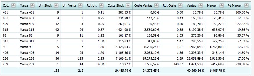 Por ejemplo, como se puede ver en la imagen siguiente (obtenida al hacer clic sobre el gráfico de posicionamiento), de la Marca 451 se han vendido 1 unidad en el último año y tenemos 9 unidades, lo que da una rotación de 0,11, sin embargo, de la Marca 266, en el último año se han vendido 125 unidades y en stock tenemos 56 por lo que la rotación es de 2,33, es decir, en un año somos capaces de vender 2,23 veces la cantidad que tenemos en el almacén.