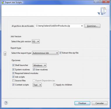 - Incluir objetos dependientes: podemos hacer que en el directorio de exportación se incluyan todos los elementos necesarios para la ejecución independiente del trabajo (módulos talend, librerias java, rutinas del sistema). Esto nos permitirá llevarnos el job y ejecutarlo en cualquier sitio sin necesitar nada mas (solo la correspondiente maquina virtual java).