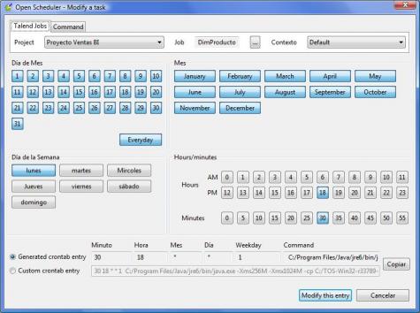 Para realizar la planificación de los jobs, podriamos utilizar el CRON del sistema operativo Unix/Linux (preparando su correspondiente fichero crontab ), o bien a nivel de Windows utilizando AT o alguna herramienta similar como WinAT. Talend proporciona una herramienta para preparar los ficheros crontab. La herramienta es el OpenScheduler (tal y como vemos en la imagen).