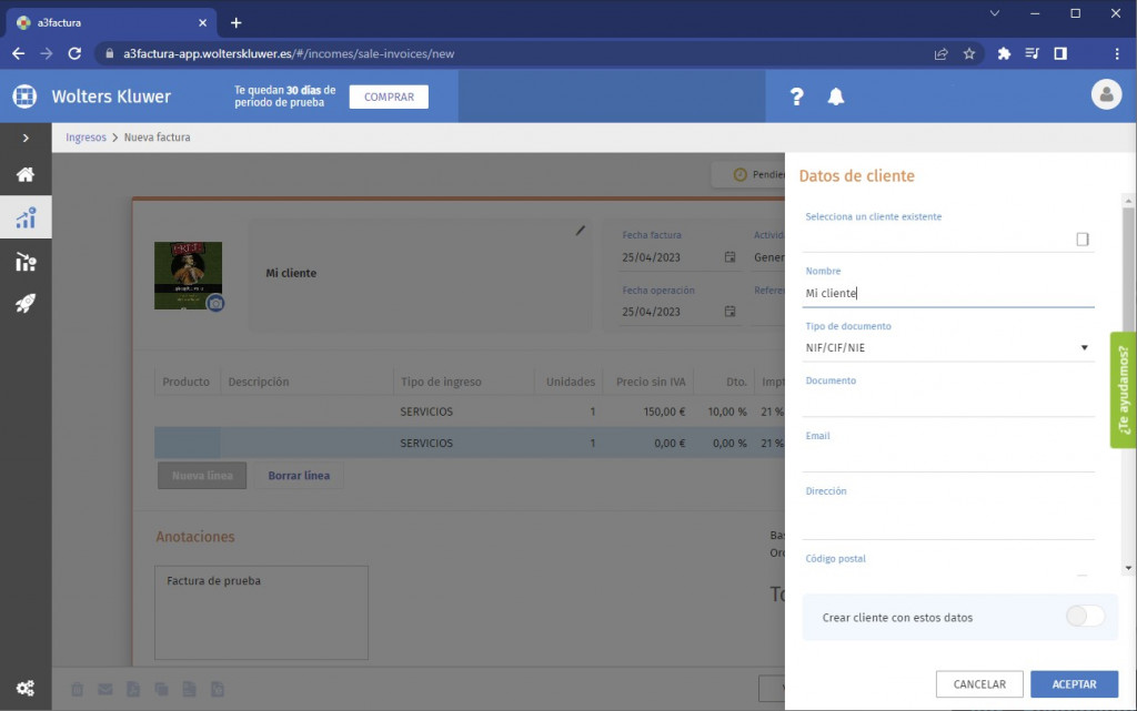 Además, a3factura tiene un precio muy competitivo, a partir de 9,95€ al mes sin límite de facturas ni datos. Se puede probar fácilmente, ya que dispone de 1 mes de prueba sin compromiso.