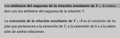 Más concretamente, para poder aplicar la unión a dos relaciones, es preciso que las dos relaciones sean compatibles. Decimos que dos relaciones T y S son relaciones compatibles si: