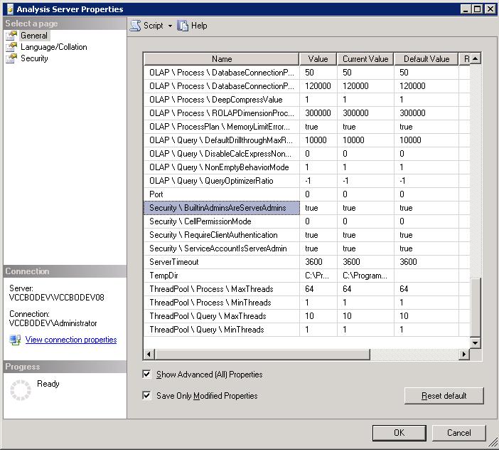 La seguridad en Analysis Services está basada en la seguridad propia de Windows. Los usuarios se autentican usando sus cuentas de Windows locales (del servidor) o de dominio y pueden tener derechos segun los roles a los que pertenecen. ¿Que quiere decir esto? Que por decreto y si no hacemos cambios en la configuración de nuestra instancia de SSAS los usuarios que pertenecen al rol de Administradores del SO pueden entrar como Administradores también en la instancia. Para cambiar este comportamiento y limitar la administración de SSAS a los usuarios que hemos marcado como tales debemos cambiar el valor de la propiedad Security\BuiltinAdminsAreServerAdmins y ponerlo a false. Pero cuidado al hacer esto, no vayamos a quedarnos sin administradores, previamente debemos asegurarnos de que tenemos otra cuenta en la lista de administradores de SSAS.