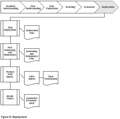 La creación del modelo no es generalmente el final del proyecto. Incluso si el objetivo del modelo es de aumentar el conocimiento de los datos, el conocimiento ganado tendrá que ser organizado y presentado en el modo en el que el cliente pueda usarlo. Ello a menudo implica la aplicación de modelos "vivos" dentro de un proceso de toma de decisiones de una organización, por ejemplo, en tiempo real la personalización de página Web o la repetida obtención de bases de datos de mercadeo. Dependiendo de los requerimientos, la fase de desarrollo puede ser tan simple como la generación de un informe o tan compleja como la realización repetida de un proceso cruzado de minería de datos a través de la empresa. En muchos casos, es el cliente, no el analista de datos, quien lleva el paso de desarrollo. Sin embargo, incluso si el analista realizara el esfuerzo de despliegue, esto es importante para el cliente para entender de frente que acciones necesita para ser ejecutadas en orden para hacer uso de los modelos creados actualmente.