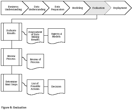 Los pasos de la evaluación anterior trata con factores como la exactitud y la generalidad del modelo. Este paso evalúa el grado al que el modelo responde (encuentra) los objetivos de negocio y procura determinar si hay alguna decisión de negocio por el que este modelo es deficiente. Otra opción de evaluación es probar el/los modelo/s sobre aplicaciones de prueba en la aplicación real, si el tiempo y las restricciones de presupuesto lo permiten.