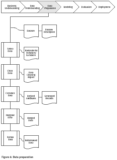 La fase de preparación de datos cubre todas las actividades necesarias para construir el conjunto de datos final [los datos que serán provistos en las herramientas de modelado] de los datos en brutos iniciales. Las tareas de preparación de datos probablemente van a ser realizadas muchas veces y no en cualquier orden prescripto. Las tareas incluyen la selección de tablas, registros, y atributos, así como la transformación y la limpieza de datos para las herramientas que modelan.
