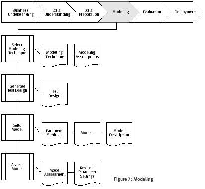 En esta fase, varias técnicas de modelado son seleccionadas y aplicadas, y sus parámetros son calibrados a valores óptimos. Típicamente hay varias técnicas para el mismo tipo de problema de minería de datos. Algunas técnicas tienen requerimientos específicos sobre la forma de datos. Por lo tanto, volver a la fase de preparación de datos es a menudo necesario.
