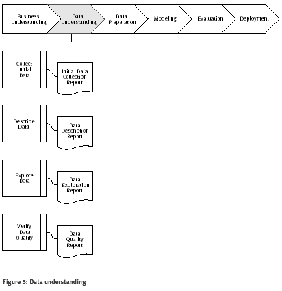 La fase de entendimiento de datos comienza con la colección de datos inicial y continua con las actividades que le permiten familiarizar primero con los datos, identificar los problemas de calidad de datos, descubrir los primeros conocimientos en los datos, y/o descubrir subconjuntos interesantes para formar hipótesis en cuanto a la información oculta.