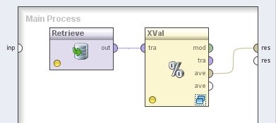 Este es el primer ejemplo de un proceso más complejo. Los operadores construyen una estructura de árbol. Por ahora esto es suficiente para aceptar que el operador de validación cruzada requiere un conjunto de ejemplos como entrada y entrega un vector de valores de performance como salida. Además gestiona la división en ejemplos de entrenamiento y de prueba. Los ejemplos de entrenamiento se utilizan como entrada para el aprendiz de entrenamiento, el cual entrega un modelo. Este modelo y los ejemplos de prueba forman la entrada de la cadena de aplicadores que entregan la performance para este conjunto de prueba. Los resultados para todos los posibles conjuntos de prueba son recogidos por el operador de validación cruzada. Finalmente se calcula el promedio y se entrega como resultado.