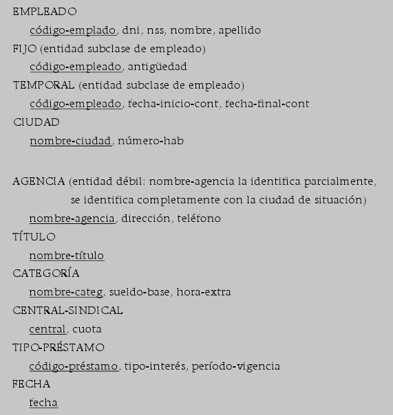 1) La entidad agencia se ha considerado una entidad débil porque su atributo nombre-agencia sólo permite distinguir las agencias situadas en una misma ciudad, pero para identificar de forma total una agencia, es necesario saber en qué ciudad está situada. De este modo, la interrelación situación es la que nos permite completar la identificación de la entidad agencia.