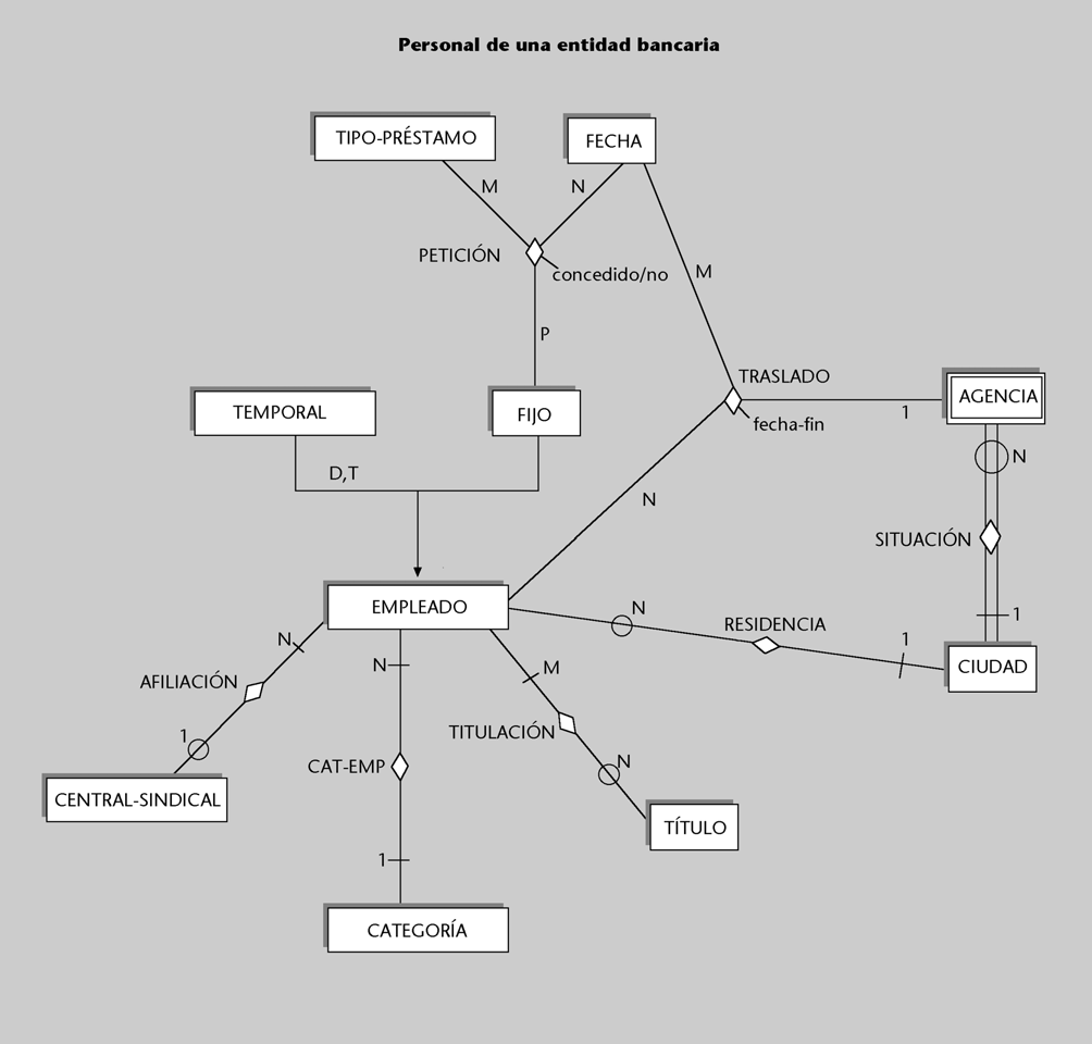 Notad que la entidad agencia se ha conectado con “uno” en la interrelación traslado, porque no puede ocurrir que, en una fecha, un empleado determinado sea trasladado a más de una agencia.
