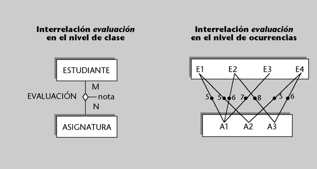 y {sem} referencia SEMESTREPara identificar completamente la relación, la clave debe constar de la clave de estudiante, de la clave de asignatura y de la clave de semestre. Si nos faltase una de las tres, la clave de la relación podría tener valores repetidos. Consideremos, por ejemplo, que no tuviésemos la clave de semestre. Dado que semestre está conectada con “muchos” en la interrelación, puede haber estudiantes que han sido evaluados de una misma asignatura en más de un semestre. Entonces, para estos casos habría valores repetidos en la clave de la relación EVALUACION-SEMESTRAL.
