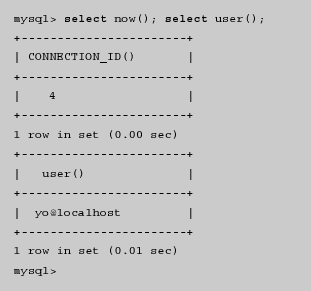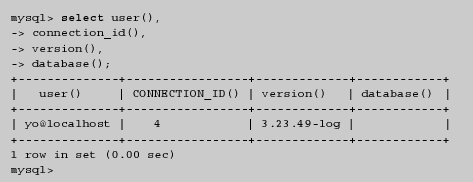 En esta consulta se solicita, a través de funciones incorporadas en el SGBD, el nombre del usuario actual de MySQL, el número de conexión al servidor, la versión del servidor y la base de datos en uso. Las funciones se reconocen por los paréntesis al final. mysql entrega sus resultados en tablas, en la que el primer renglón son los encabezados de las columnas. Es importante no dejar espacio entre el nombre de una función y los paréntesis, de otro modo, mysql marcará un mensaje de error.