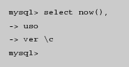 “> en dos renglones”;Al principio, es común olvidar el punto y coma al introducir un comando y, también, olvidar cerrar las comillas. Si éste es el caso, hay que recordar que mysql no interpreta lo que está entre comillas, de tal modo que para utilizar el comando de cancelación ’\c’ es preciso antes cerrar las comillas abiertas: