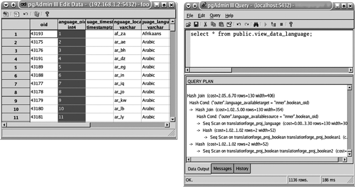 pgAdmin3 también incorpora funcionalidades para realizar consultas, examinar su ejecución (como el comando explain) y trabajar con los datos.