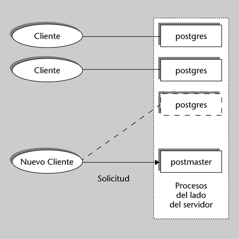Un proceso servidor postgres puede atender exclusivamente a un solo cliente; es decir, hacen falta tantos procesos servidor postgres como clientes haya. El proceso postmaster es el encargado de ejecutar un nuevo servidor para cada cliente que solicite una conexión.
